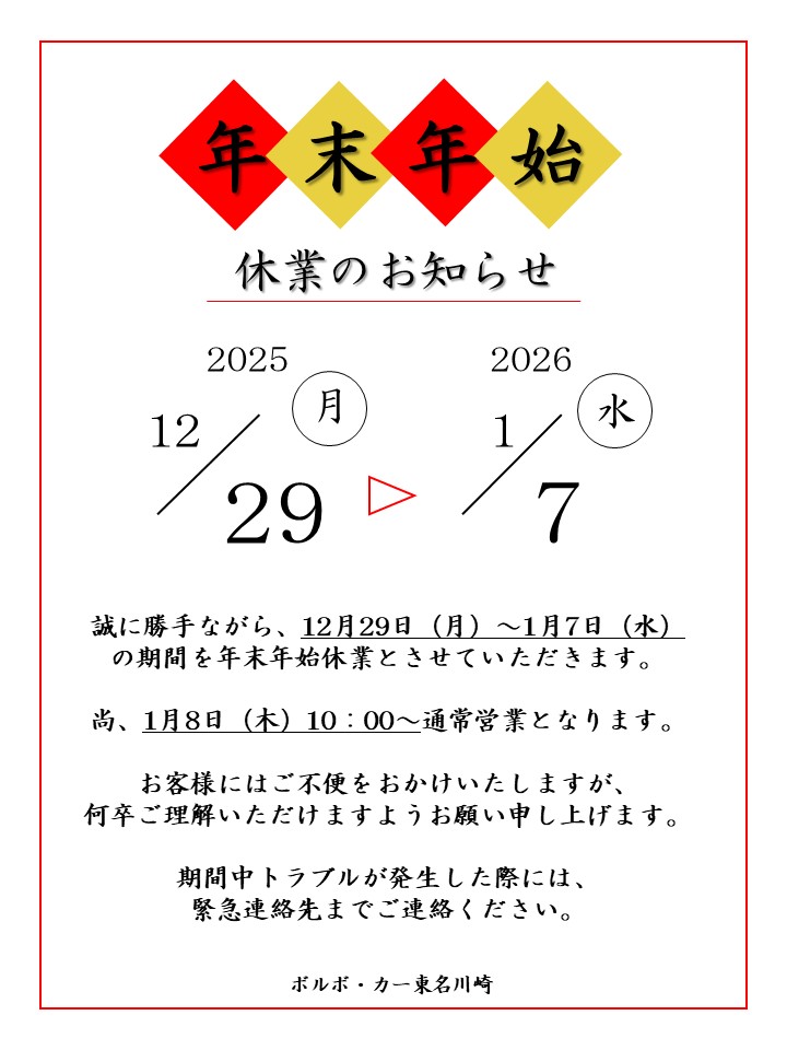 誠に勝手ながら、12月29日(月)~1月7日(水)の期間を年末年始休業とさせていただきます。